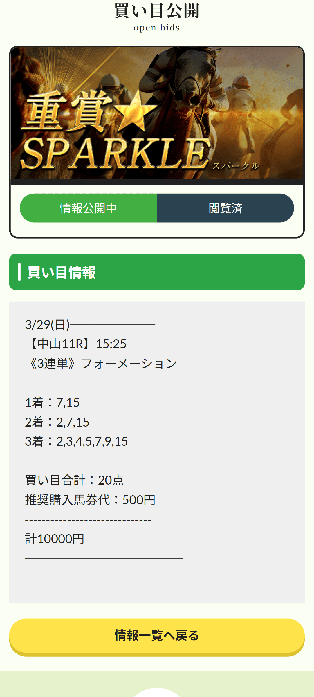 えぶりの重賞★SPARKLEは、買い目の並びを見てかなり好印象でした。1着を7と15の2頭、2着を2・7・15、3着を2・3・4・5・7・9・15。こういう形って、一見すると広そうに見えるんですが、実際は勝ち切る馬の想定をかなり狭く持っているんですよね。しかも、相手の置き方が雑じゃない。何でもかんでも入れてるんじゃなくて、3着欄だけ少し広げて配当も残しにいってる感じがある。自分は52歳で建設関係の仕事をしていますが、長く競馬をやってると、こういう「無理に絞りすぎないのに甘くもない」買い目はすぐ分かります。500円×20点で計10,000円、払戻588,000円なら十分すぎる内容。重賞★SPARKLEは、一撃狙いに見えて実はかなり冷静に組まれている情報でした。