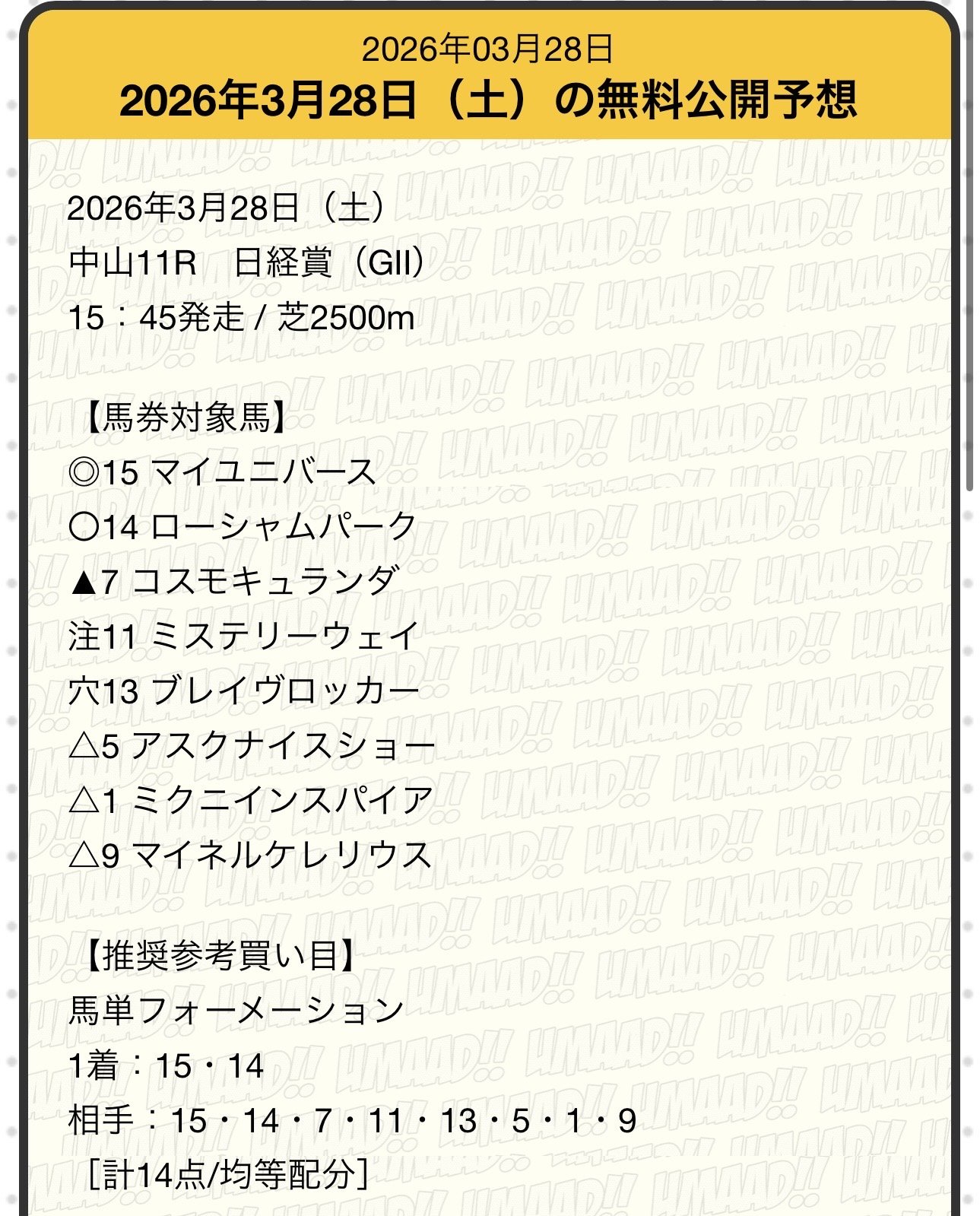 見事に無料予想で的中を届けてくれたのはうまあど